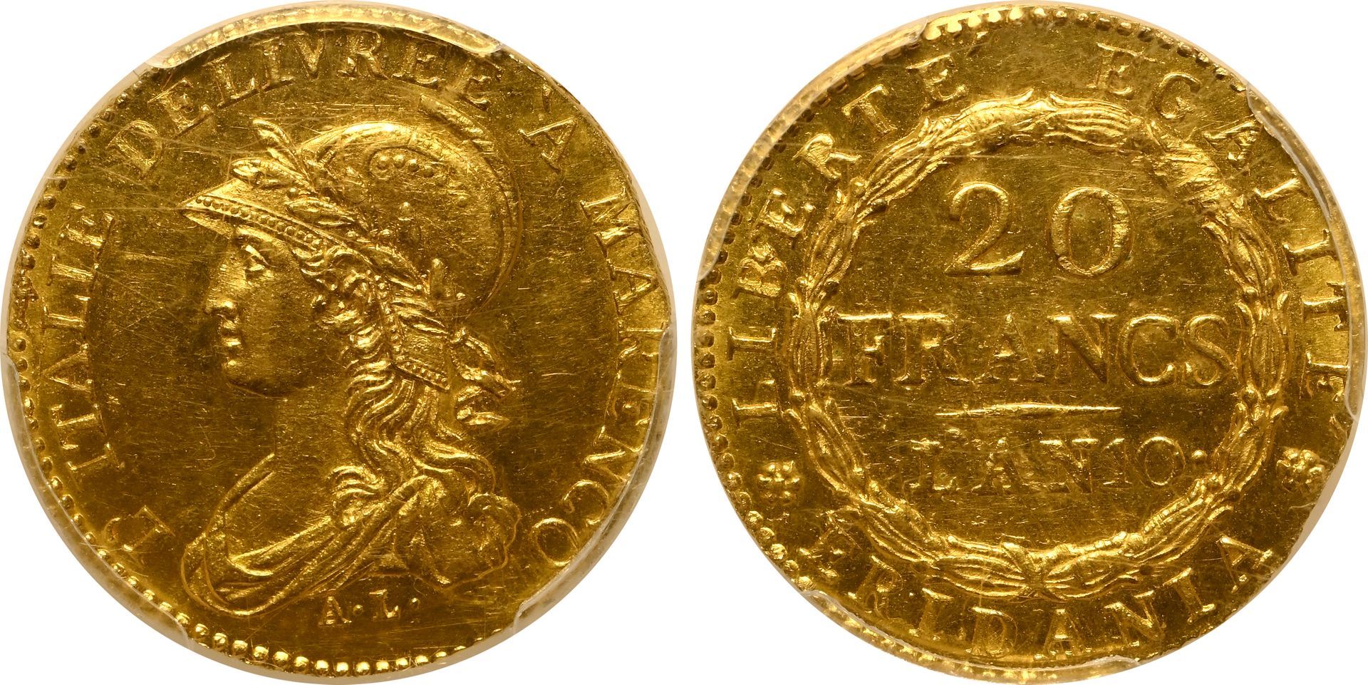 An extremely scarce coin commemorating Napoleon's victory in the Battle of Marengo. The first-ever coin to be struck under a decimal currency system. Well struck with good details. The finest graded at PCGS, with 4 coins graded higher at NGC. One of the finest known for this scarce turning point in numismatic history.