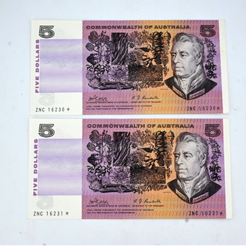 Renniks R203SF. Very light signs of handling and a teller flick prevents this scarce pair of $5 star notes from achieving an Uncirculated grade. Serials ZNC 16230*, ZNC 16231*. Possibly one of the finest pairs known and exceedingly rare in this condition.