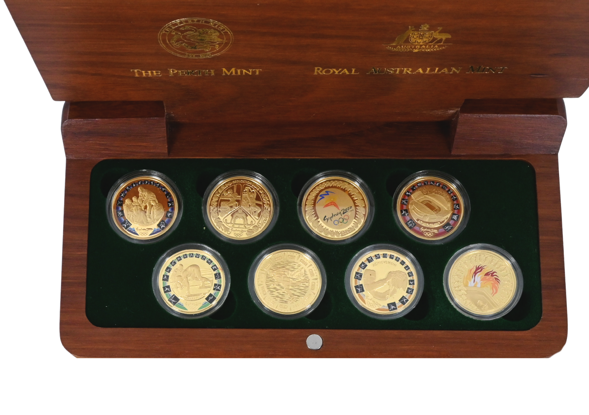 The most prestigious coin set to come out of the Sydney Olympics, this lot includes eight pure gold coins, each weighing 10 grams. Actual Gold Weight: 80g.