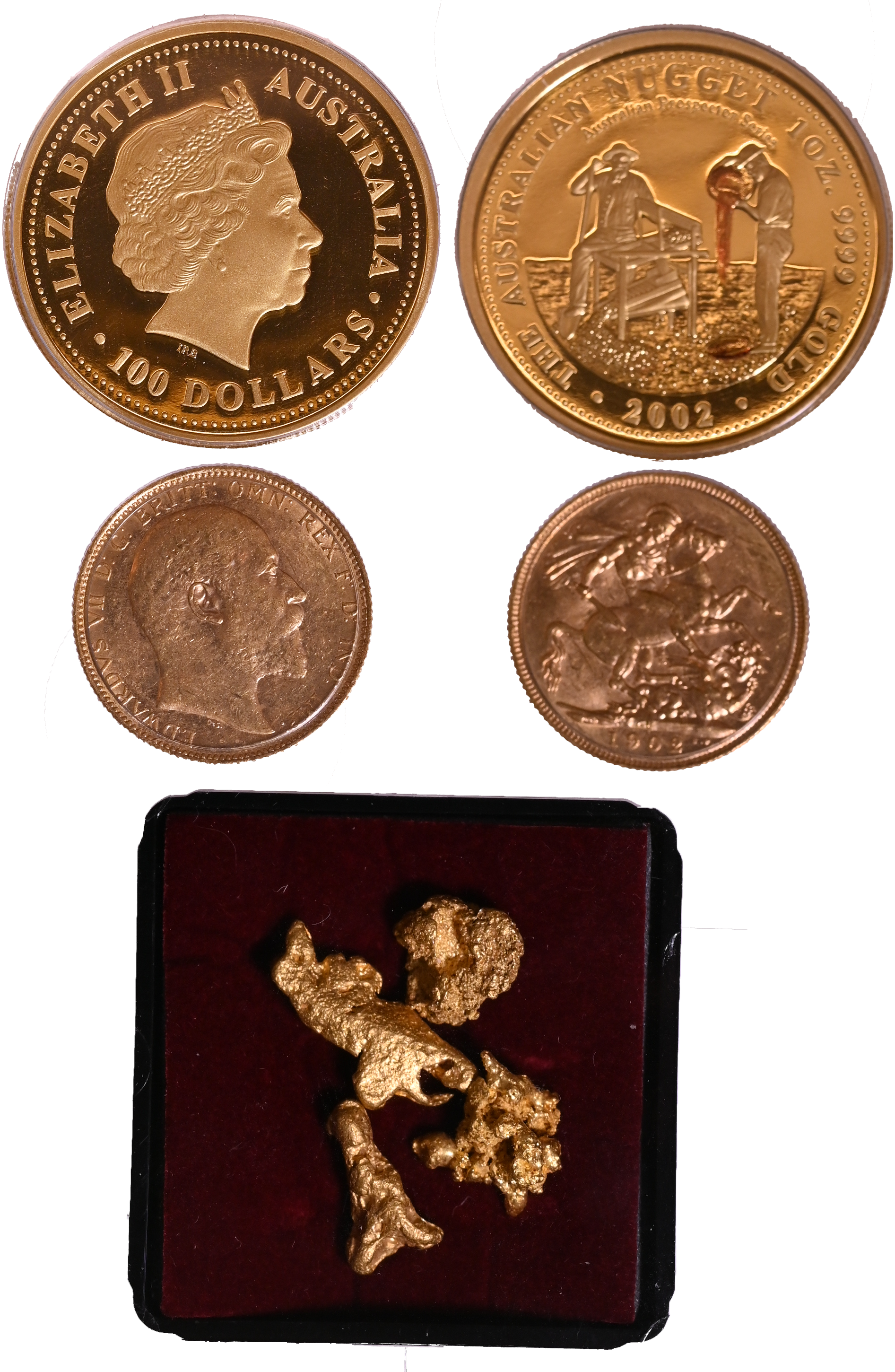 Maximum mintage of 150 sets, comprising the 1oz Prospector Proof Gold Coin, an Almost Uncirculated 1902-P Sovereign, and several loose Gold Nuggets weighing approximately 7.55 grams. COA number 068. As issued, aUNC – FDC.