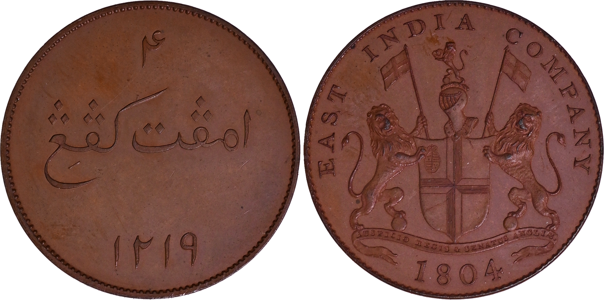 The largest denomination of the scarce proof Kepings series, issued in Sumatra under the East India Company. This thick planchet East Asian rarity exhibits a deeply impressed strike and attractive matte-gloss surfaces.