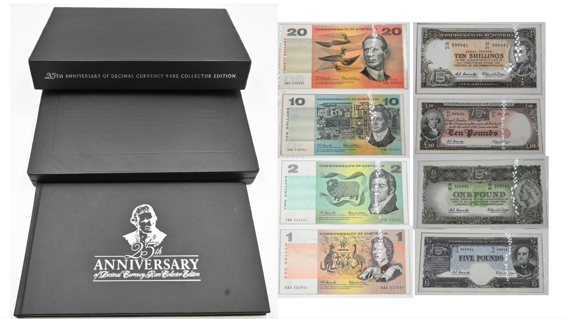 The set comprises four pre-decimal notes, from Ten Shillings through to Ten Pounds, all bearing the NPA special last prefix, taken from the RBA archives and never intended for circulation. Accompanying these are four decimal issues - One Dollar, Two Dollars, Ten Dollars and Twenty Dollars - each with first prefixes and similarly sourced from the RBA archives, all sharing the matching final digits ‘941.