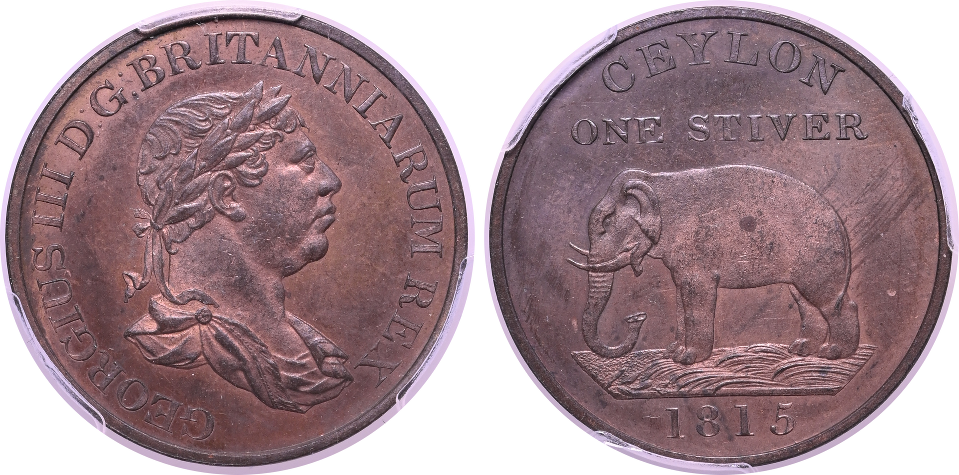 The 1815 Stiver was struck in the immediate aftermath of major political change on the island: 1815 marks the year the Kandyan Kingdom fell and British control over Ceylon (modern Sri Lanka) was consolidated, accelerating the island’s integration into imperial trade and administration. Outstanding reddish-brown toning, firmly on the side of red, with glimpses of orange-red tone around the obverse legends in particular. One of the finest known examples to come to market in the past 20 years. A fantastic Proof strike, and one for the connoisseur of World coinage. The single finest known Top Pop in the PCGS Population Report 1/0.